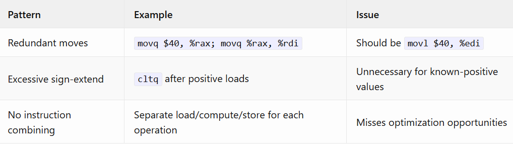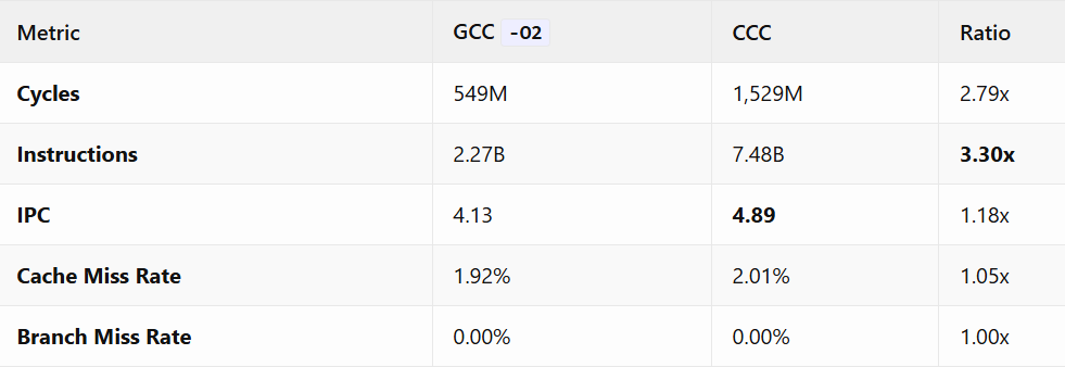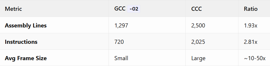 -O2but 12% faster than GCC-O03.3x Instruction Overhead: CCC generates significantly more instructions due to limited optimization
