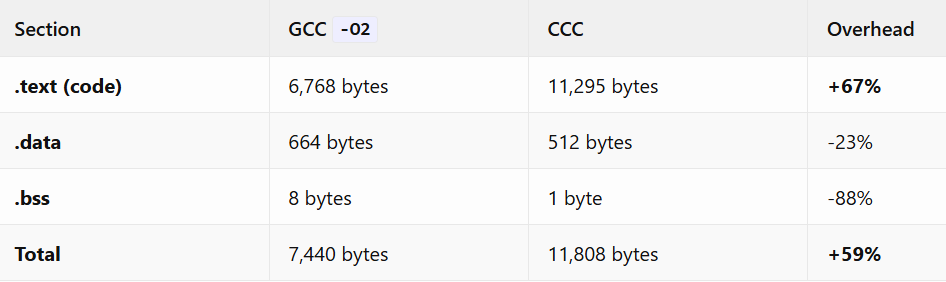 The code section bloat correlates directly with instruction count inflation. Interestingly, CCC produces smaller data sections, possibly due to different constant pooling strategies.