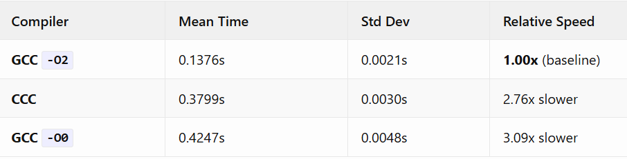 CCC is 12% faster than GCC’s unoptimized output. This indicates the compiler applies some optimizations beyond naive code generation. The performance falls between completely unoptimized and production-optimized code.