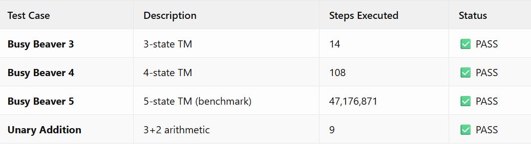 The primary performance benchmark uses the Busy Beaver 5 problem, which executes for 47,176,871 Turing machine steps, ultimately writing 4,098 ones to the tape. This workload is ideal for compiler benchmarking because it: